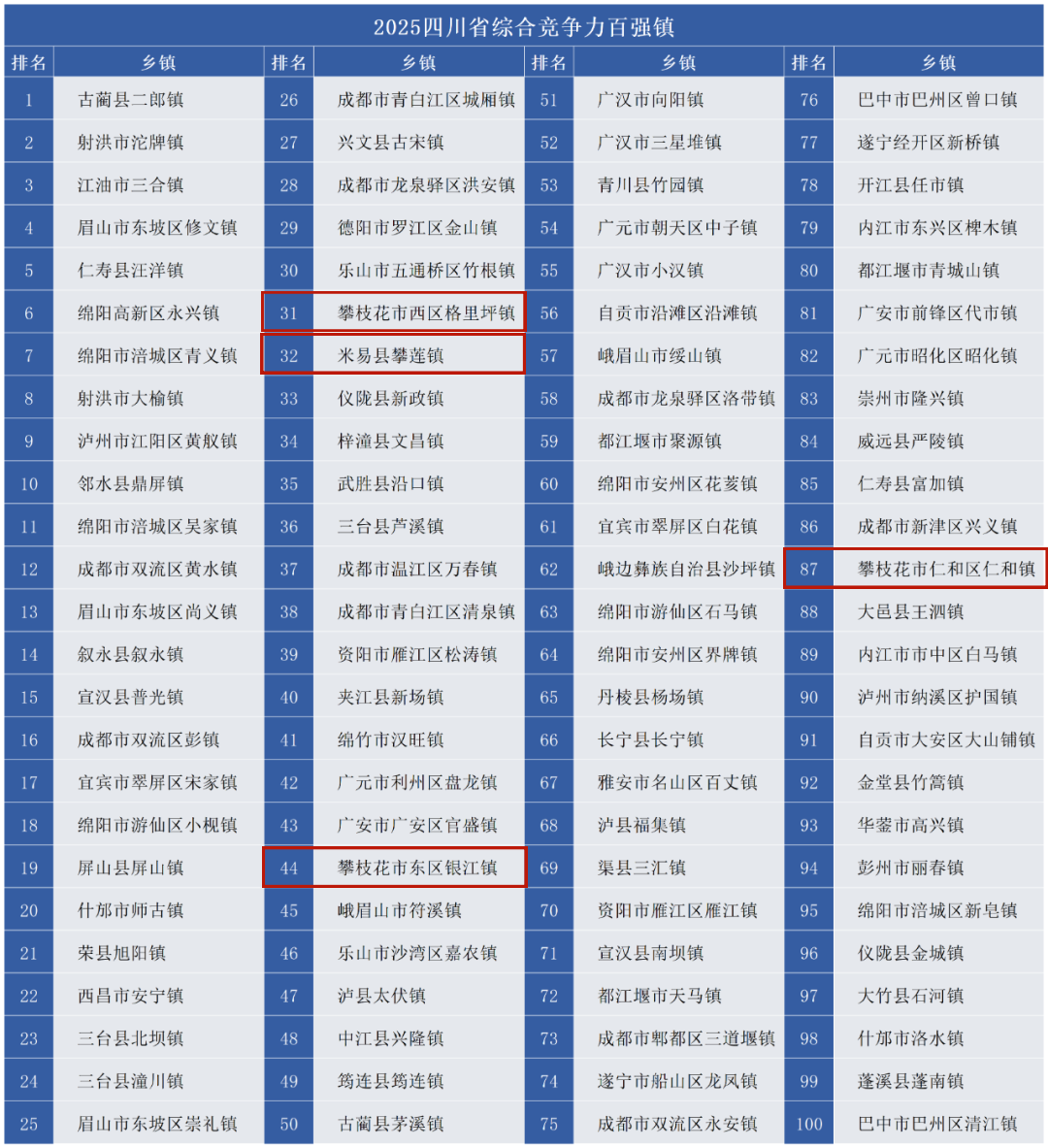 近日,竞争力智库、北京中新城市规划设计研究院等机构在北京联合发布《四川省乡镇综合竞争力报告2025》。攀枝花市西区格里坪镇、米易县攀莲镇、攀枝花市东区银江镇、攀枝花市仁和区仁和镇4地,依次上榜“2025四川省综合竞争力百强镇”名单,仿佛4位成绩斐然的“学霸”,在镇域发展的“考场”中交出了一份亮眼答卷。