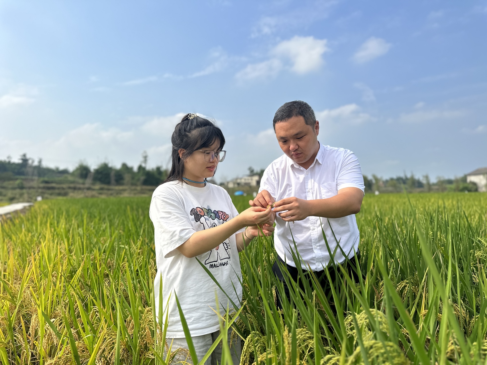 古佛镇农业综合服务中心主任范国利(左)为记者洪瑜(右)讲解再生稻机收难点。袁宇君摄