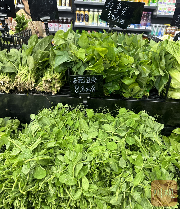 菜园地生鲜超市老板告诉川观新闻记者,她家的豌豆尖卖8.8元一斤,每天从批发市场进货,基本能卖完。“刚上市价格和去年差不多,下个月就是高峰,会便宜些。”