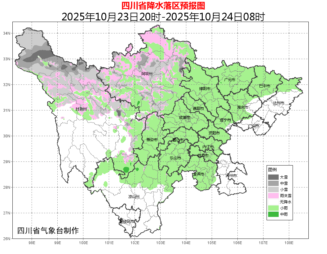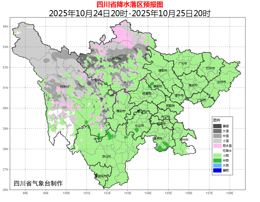 24日晚上到25日白天,盆地各市阴天有小雨,局部中雨;川西高原阴天间多云有阵雪(雨),局部中到大雪,个别暴雪;攀西地区阴天间多云有阵雨或小雨,局部中雨。
