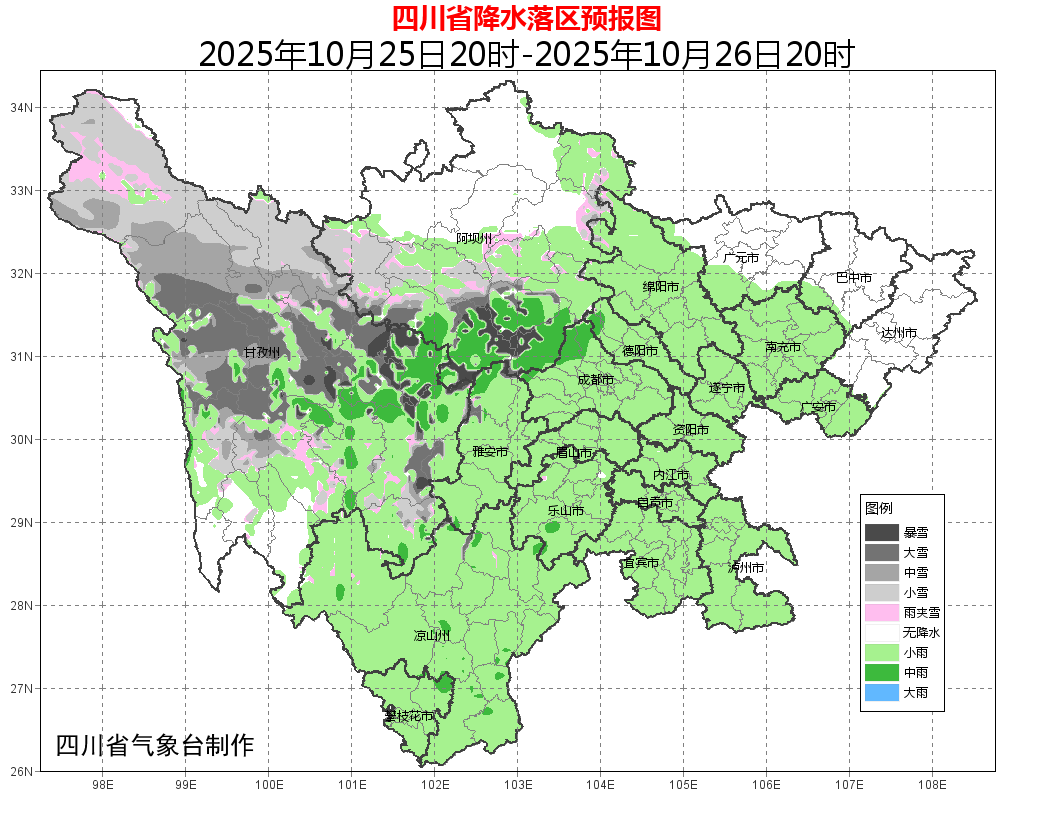 25日晚上到26日白天,盆地大部阴天间多云有小雨,局部中雨;川西高原阴天间多云有阵雪(雨),部分地方有中到大雪(雨),局部暴雪;攀西地区阴天间多云有阵雨或小雨,局部中雨。