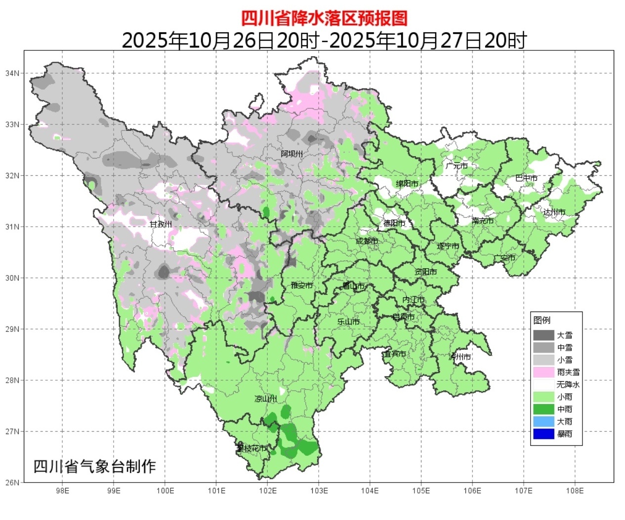 26日晚上到27日白天,盆地大部阴天间多云有阵雨或小雨;川西高原大部阴天间多云有阵雪(雨),高海拔地区有中雪,个别大雪;攀西地区阴天有小雨,南部局地有中雨。