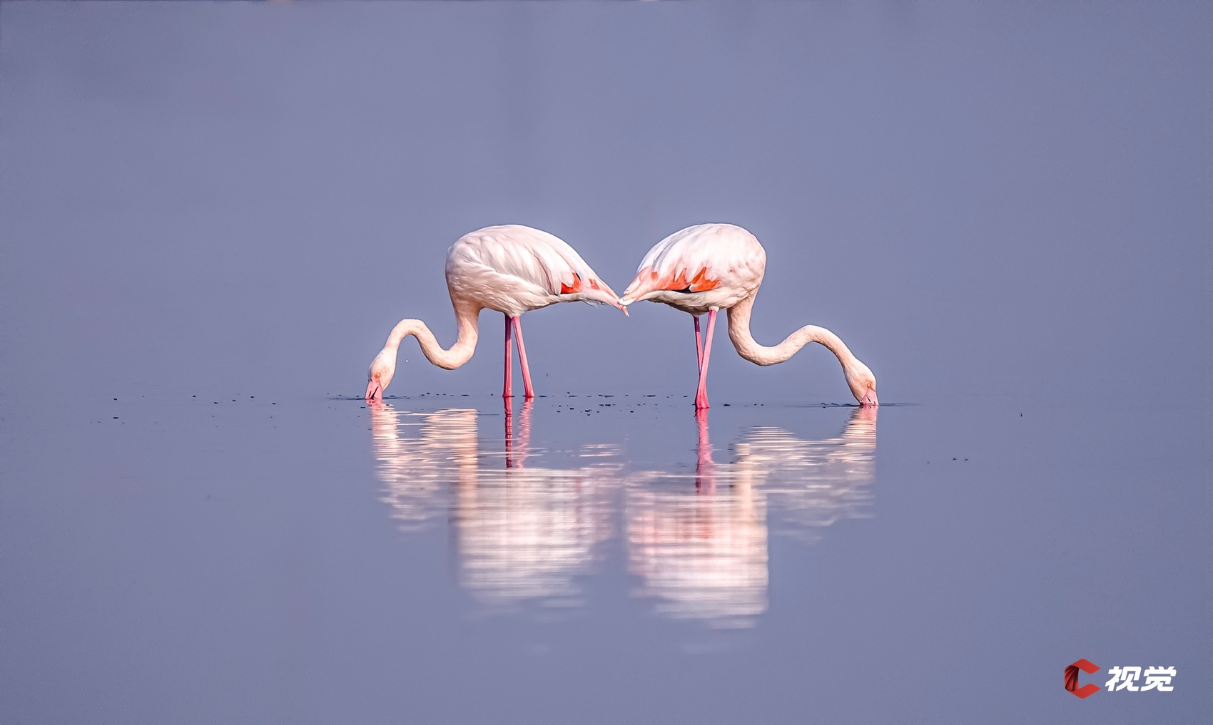 双鸟同步低头入水觅食,修长脖颈形成对称弧线,羽毛的粉红纹理在水面倒影中晕染,如自然绘制的 “对称美学画”。
