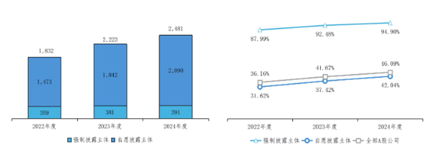 截至2024年度,A股共有2481家上市公司披露了可持续发展报告,整体披露率为46.09%。其中,自愿披露主体有2090家,披露率为42.04%;强制披露主体为391家,披露率达94.90%。