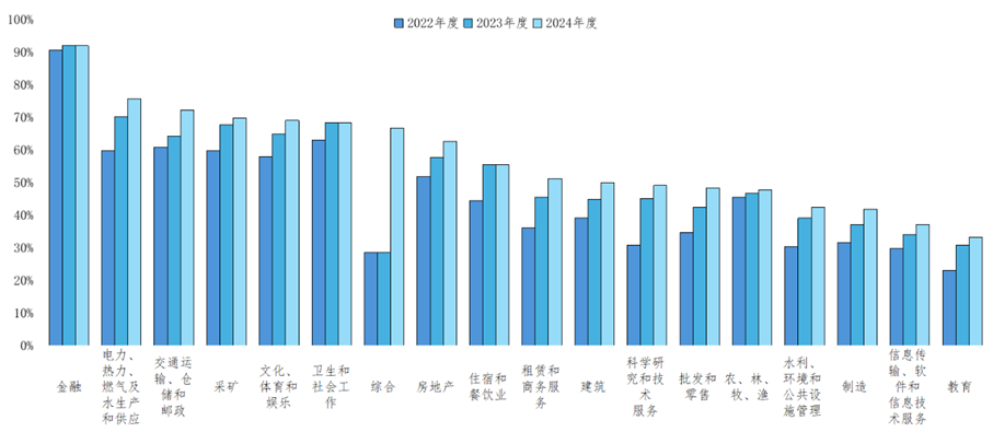 从行业分布来看,2024年度披露率最高的三大行业依次为金融业(91.94%),电力、热力、燃气及水生产和供应业(75.69%),以及交通运输、仓储和邮政业(72.32%)。而2022至2024年度披露率最低的行业为教育业,2024年披露率为33.33%。