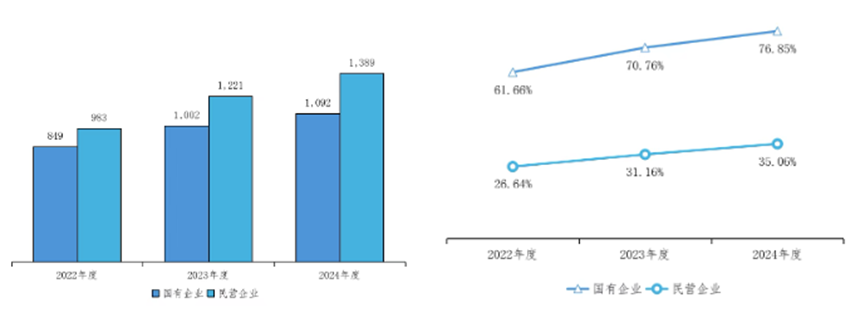 按所有制类别比较,尽管2022至2024年度民营上市公司披露报告数量多于国有上市公司,但国有上市公司披露率显著更高,2024年分别为35.06%和76.85%。