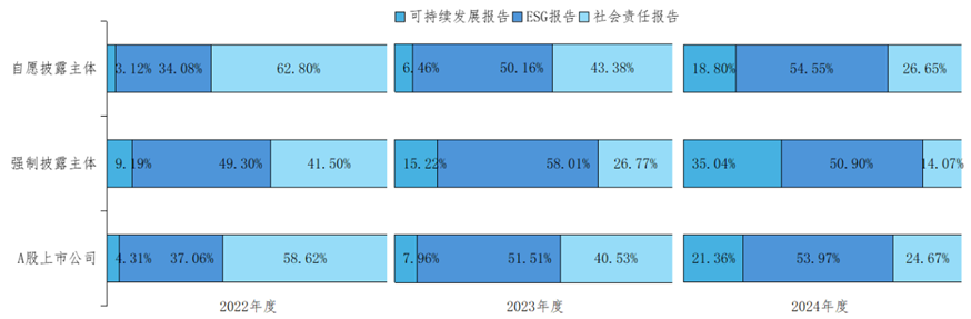 此外,在报告名称方面,ESG报告仍为最主要的报告类型,占比53.97%。强制披露主体更倾向于发布“可持续发展报告”(35.04%),远高于“社会责任报告”(14.07%);自愿披露主体则更多发布“社会责任报告”(26.65%),多于“可持续发展报告”(18.80%)。
