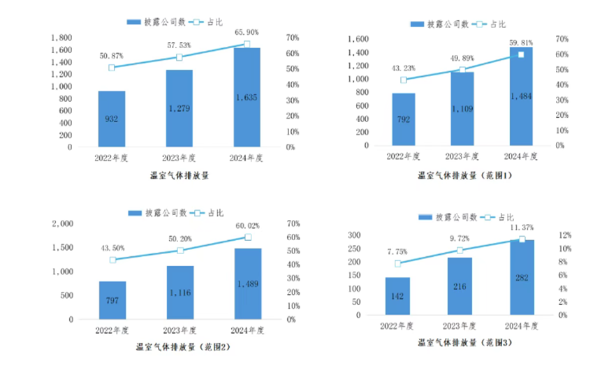 在温室气体排放量披露方面,“双碳”目标提出以来,企业重视度逐年上升。2024年度披露排放量的公司占比达65.90%(1635家),高于2023年度的57.53%(1279家)和2022年度的50.87%(932家)。其中,披露范围1、范围2和范围3的公司占比分别为59.81%(1484家)、60.02%(1489家)和11.37%(282家)。