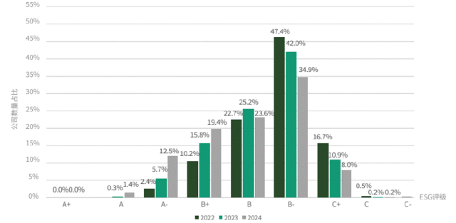 图6 2022-2024年A股上市公司ESG评级分布