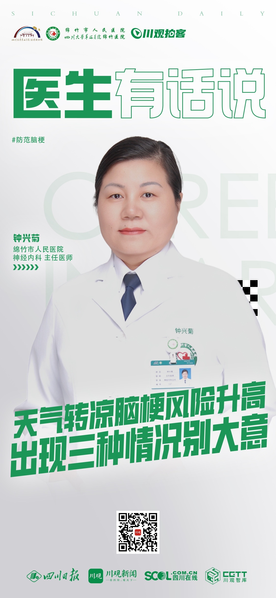 本期栏目,来自绵竹市人民医院神经内科的主任医师钟兴菊,就跟大家科普一下为何天冷容易脑梗,哪些高危人群需警惕,以及一些防护建议。