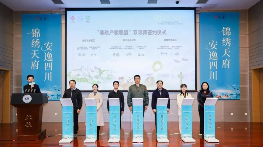 现场,崇州、青羊和新都三地航空航天重点企业与北航部分学院代表进行了“蓉航产教联盟”双导师签约仪式,就共同支持三地航空航天企业杰出人才与北航学院教授作为“产业导师+学术导师”签订备忘录,并助力校地企三方在人才共引共育、关键技术协同攻关、科技创新成果转化等方面进一步深化合作。