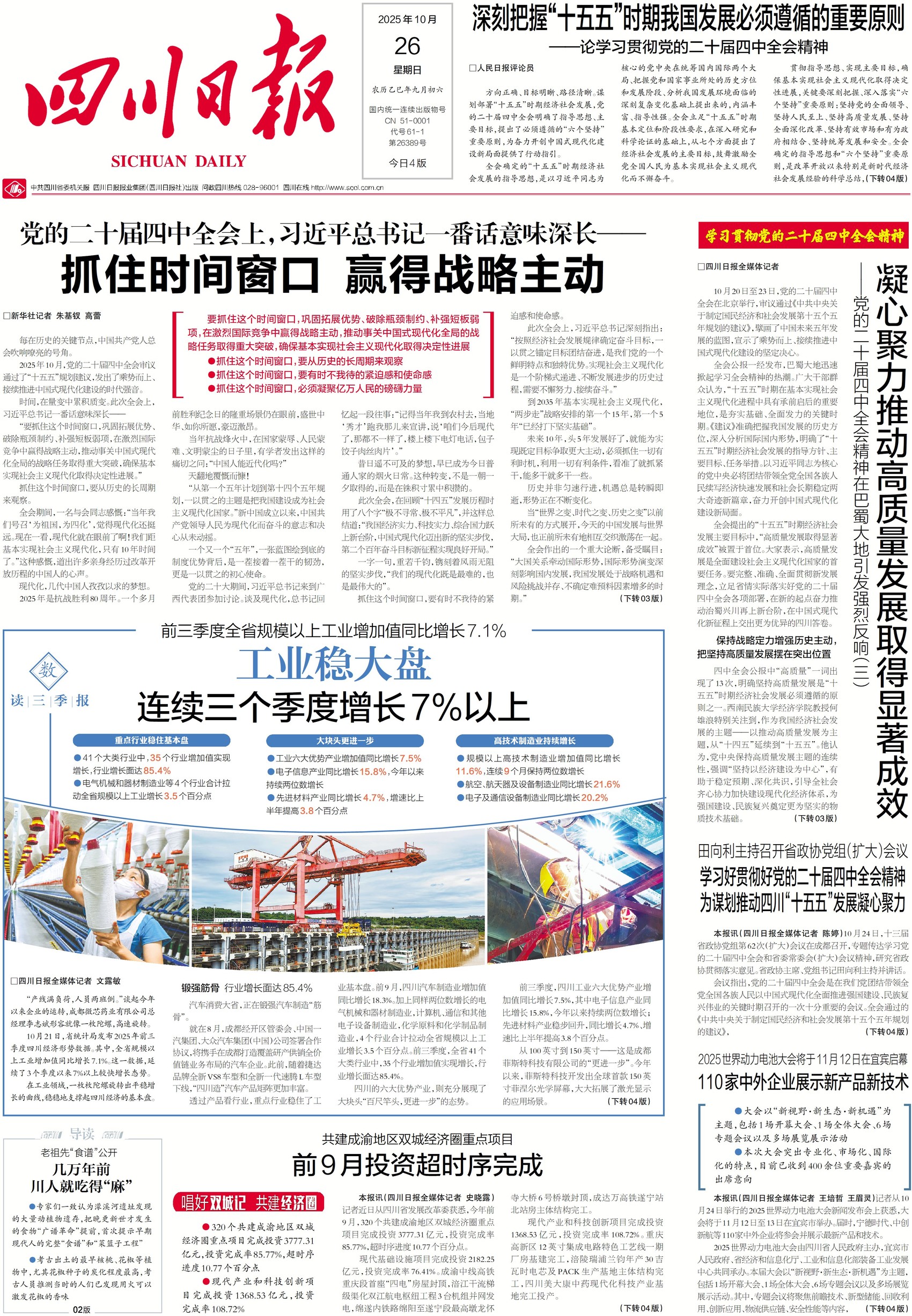 锻强汽车制造“筋骨”、六大优势产业“百尺竿头,更进一步”……10月21日,省统计局发布了2025年前三季度四川经济形势数据,从中可以看出,四川的工业稳住了大盘,连续三个季度增长7%以上,41个大类行业中,有35个增加值实现增长。想了解详细成绩?请关注今天一版。