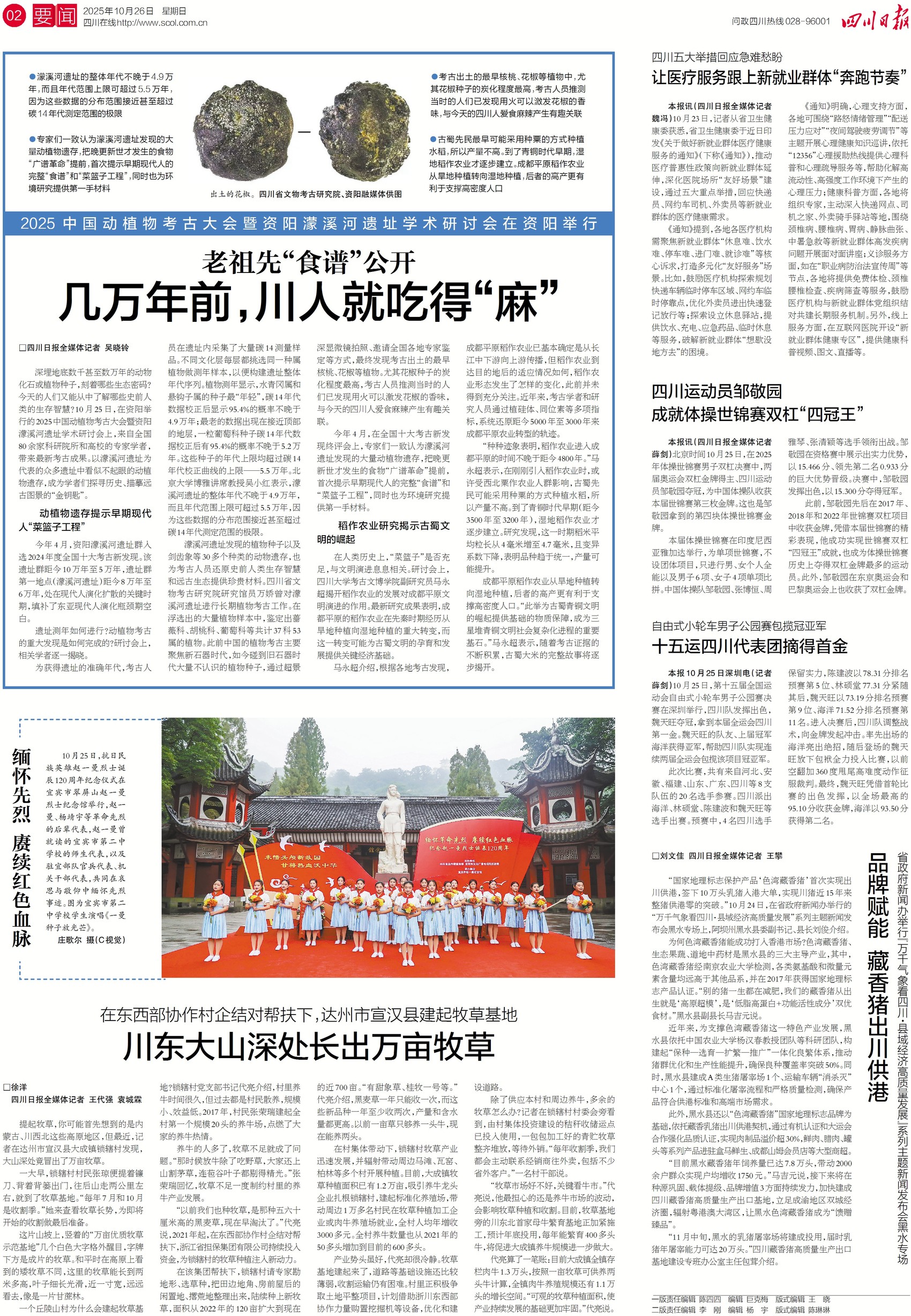 四川人为啥喜欢吃麻?因为几万年前,我们的老祖先就吃得“麻”。10月25日,在资阳举行的2025中国动植物考古大会暨资阳濛溪河遗址学术研讨会上,专家学者带来最新考古成果。考古人员发现,濛溪河遗址出土的花椒种子炭化程度最高,推测当时的人们已经发现用火可以激发花椒的香味。那么,除了花椒,老祖先的“食谱”里还有啥?关注今天二版了解一下。