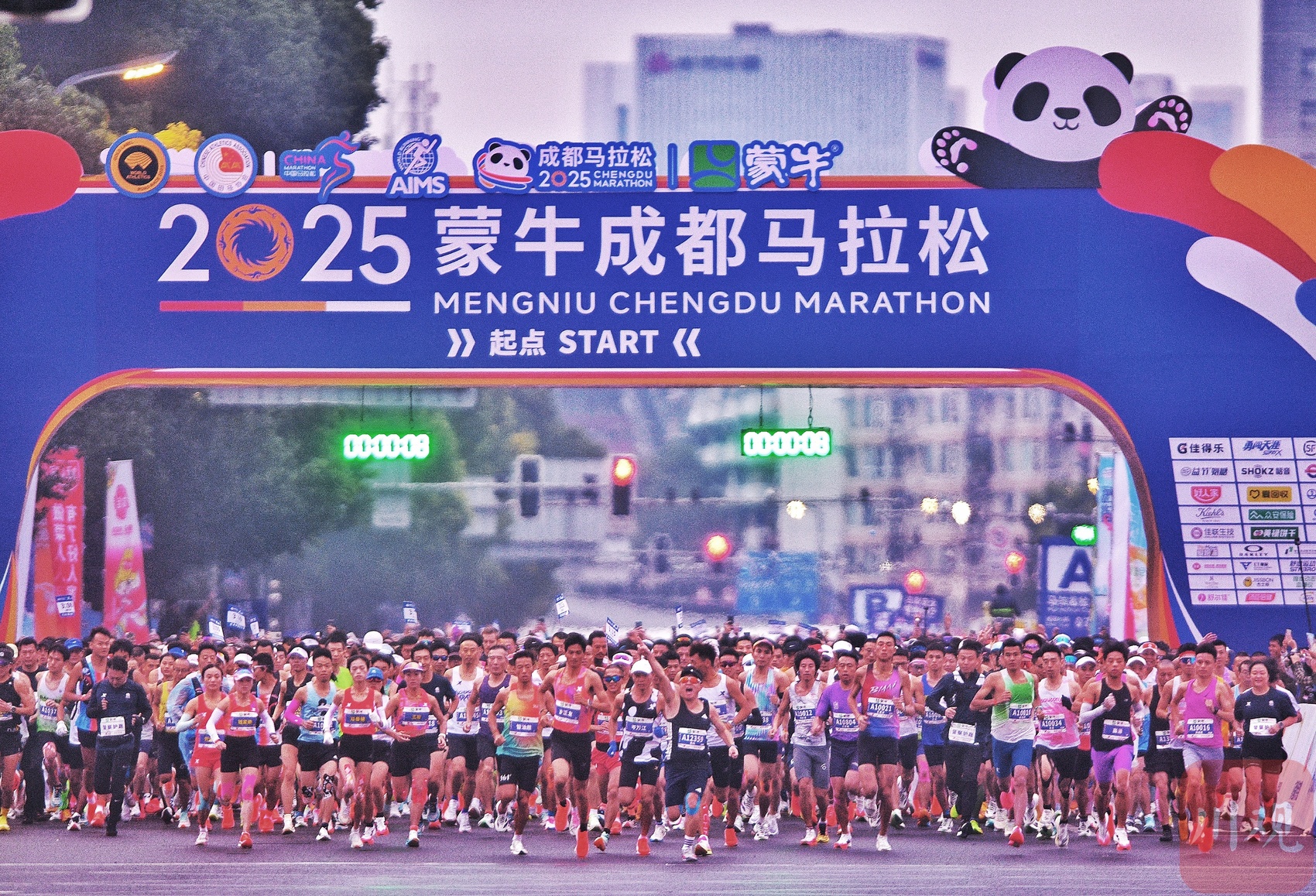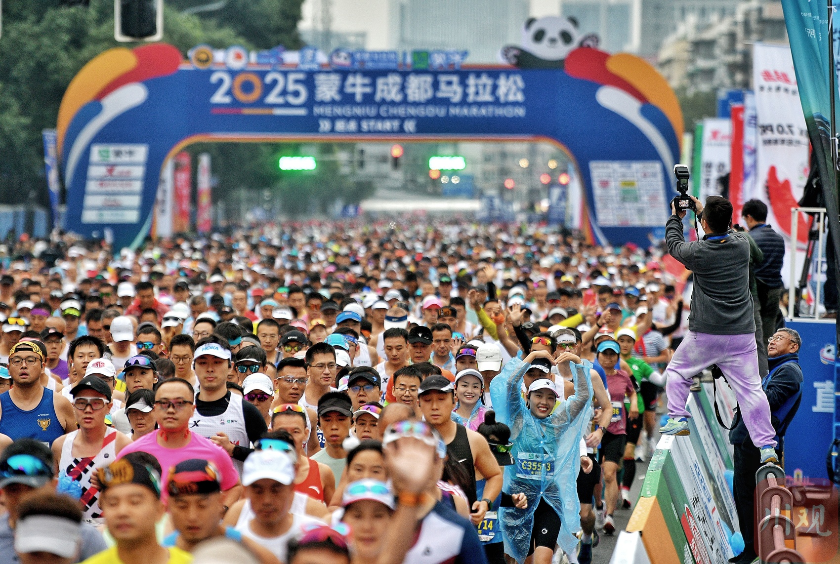 10 月 26 日上午 7 时 30 分,2025 蒙牛成都马拉松在金沙遗址博物馆起跑。作为世界田联金标赛事及全国马拉松锦标赛第三站,本届赛事吸引了来自全球 63 个国家和地区的 3.5 万名跑者参与,其中包括 25000 名全程马拉松选手与 10000 名半程马拉松选手。