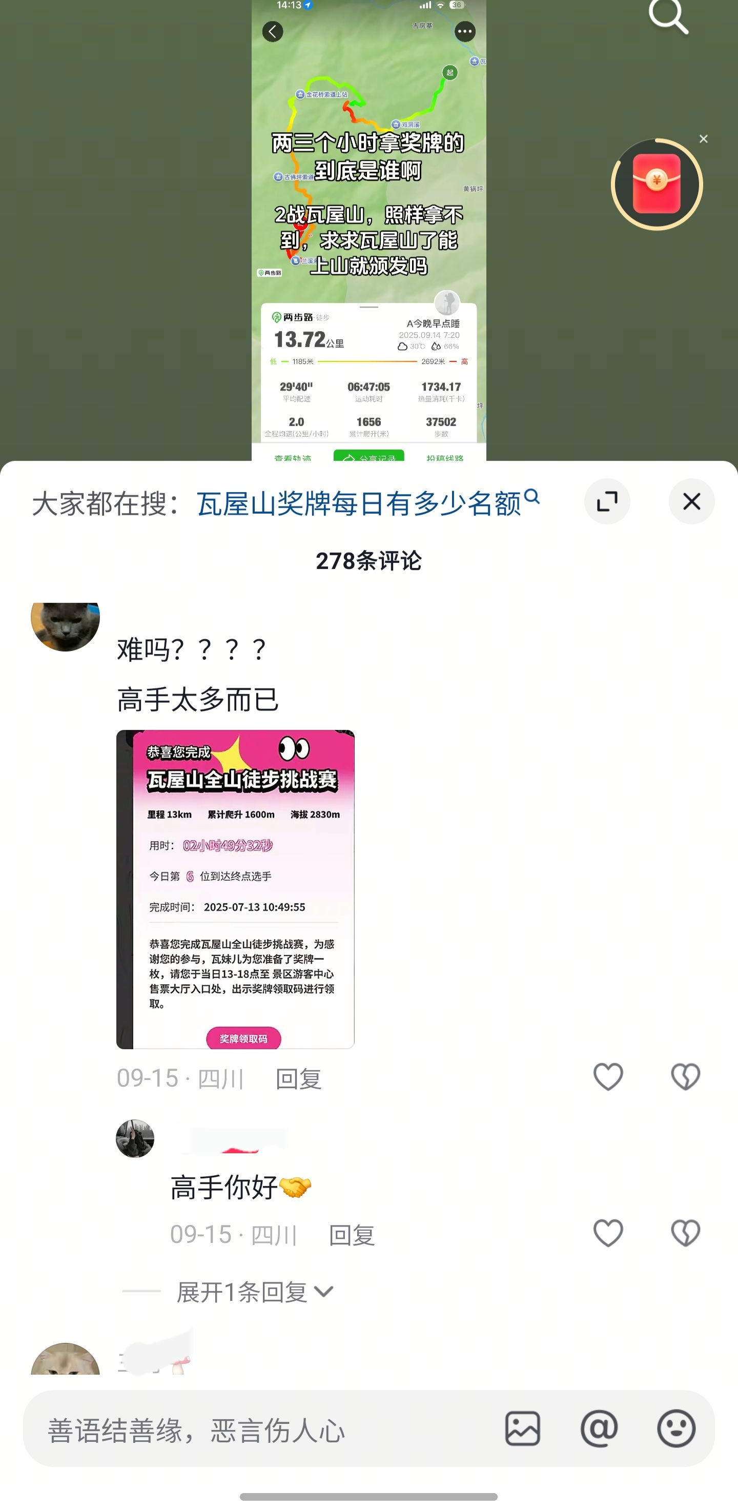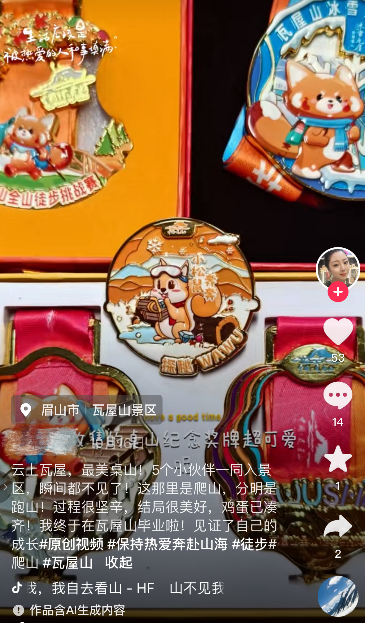 攻略、路线、时间安排……热心网友们自发分享着“夺牌秘籍”:“走B线,少3公里”“千万别周末去,有人凌晨就开始爬”“双人+天气不好+工作日,几率更大”……如今,抖音“瓦屋山奖牌”话题播放量已突破800万。