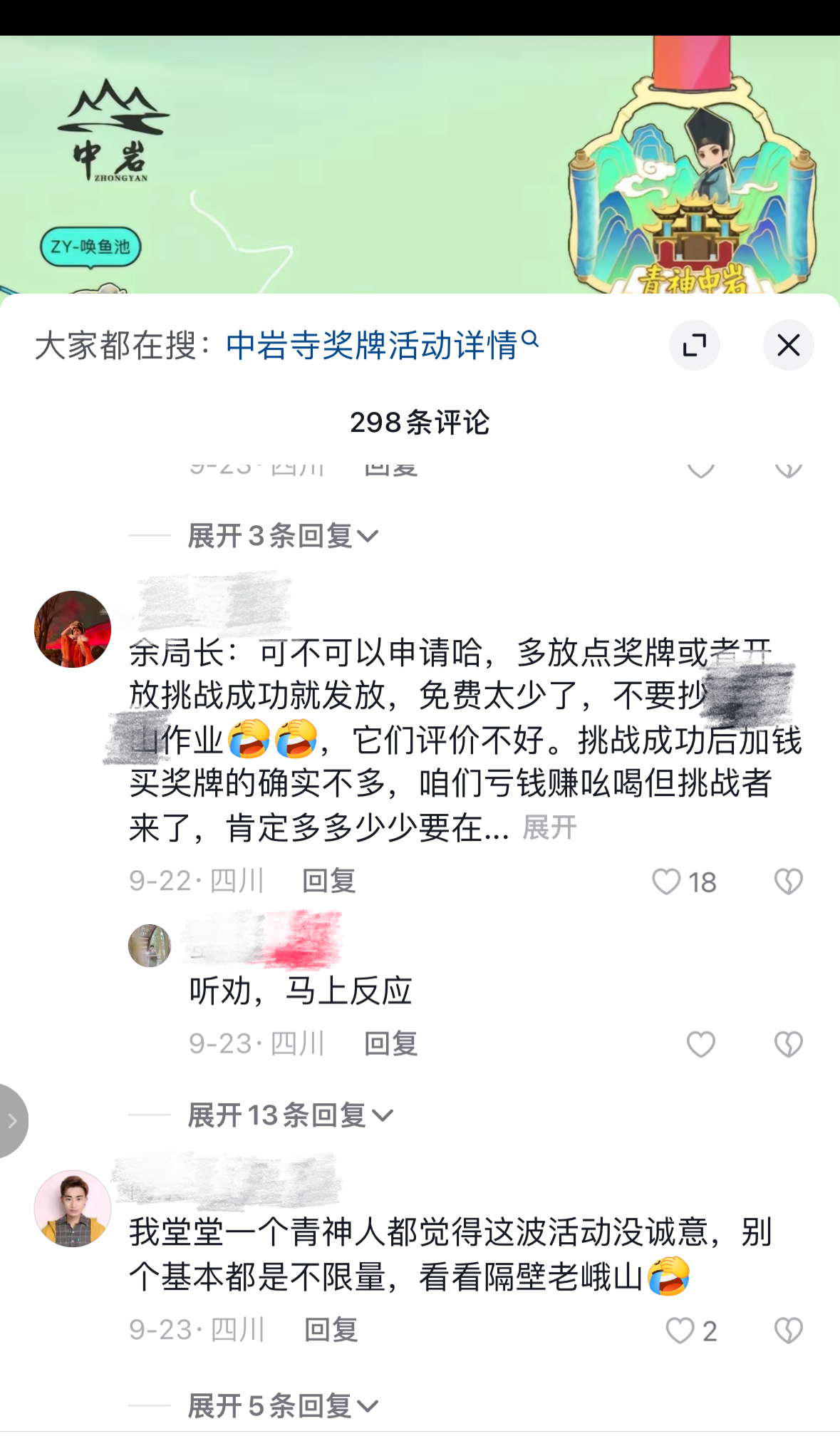 青神县中岩寺周末限前300名免费发奖牌,让网友严重“不满”,网友直接在县文广旅局局长余瑶的抖音下提要求:“余局长,可不可以申请哈,多放点奖牌,学习隔壁老峨山。”