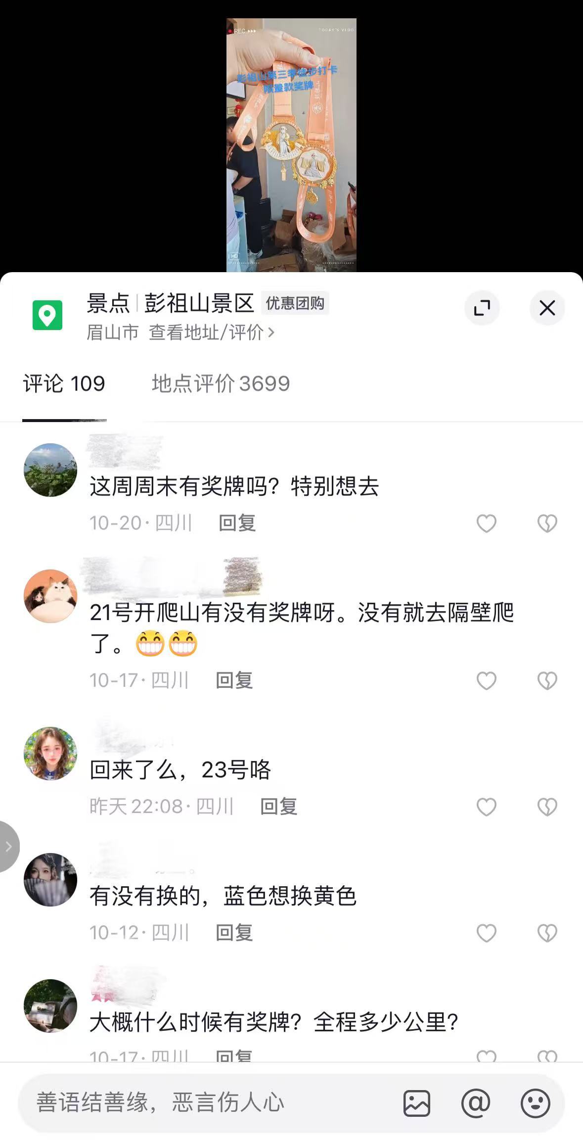 彭山区彭祖山景区官方抖音的评论区里,最新限量款奖牌预告下满是“灵魂拷问”:“10月21号确定有奖牌吗?没有我就去隔壁了”——奖牌已直接左右游客行程。