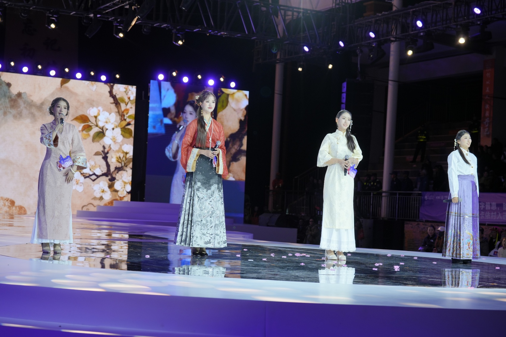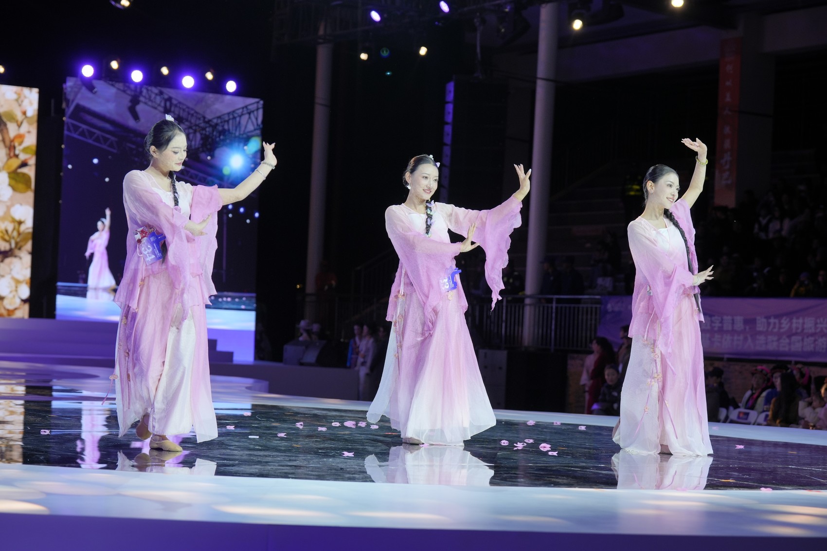 本次复赛设有三个环节:“选手风采亮相”环节中,选手们通过走秀和30秒自我介绍展现了优雅风范;“国风才艺绽放”环节,《忆梦》《牵丝戏》《簪花引》等节目轮番上演,呈现了一场传统与现代交融的视听盛宴;在“民族才艺展演”环节,《在那东山顶上》《云上丹巴》《天籁之爱》等节目将比赛推向高潮,选手们用动人的表演展现了深厚的民族文化底蕴。
