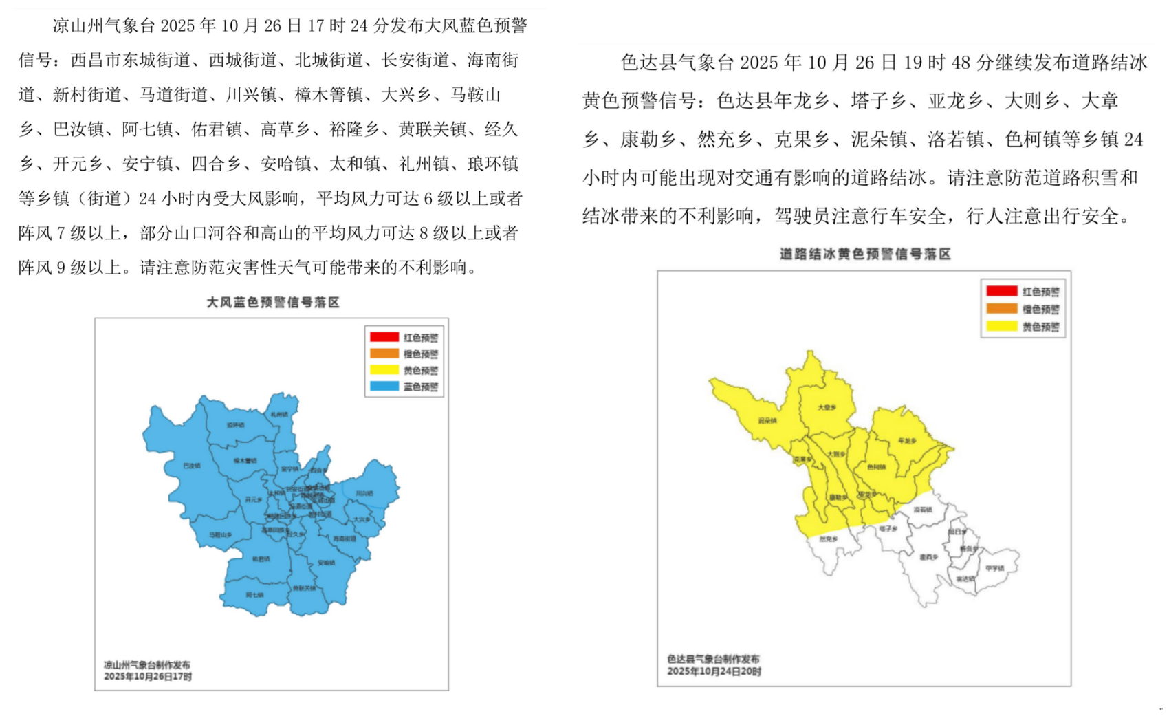 需要注意的是,截至今天9时,甘孜州色达县、新龙县、道孚县道路结冰黄色预警信号生效中,请注意防范道路积雪和结冰带来的不利影响。凉山州西昌市大风蓝色预警信号生效中。