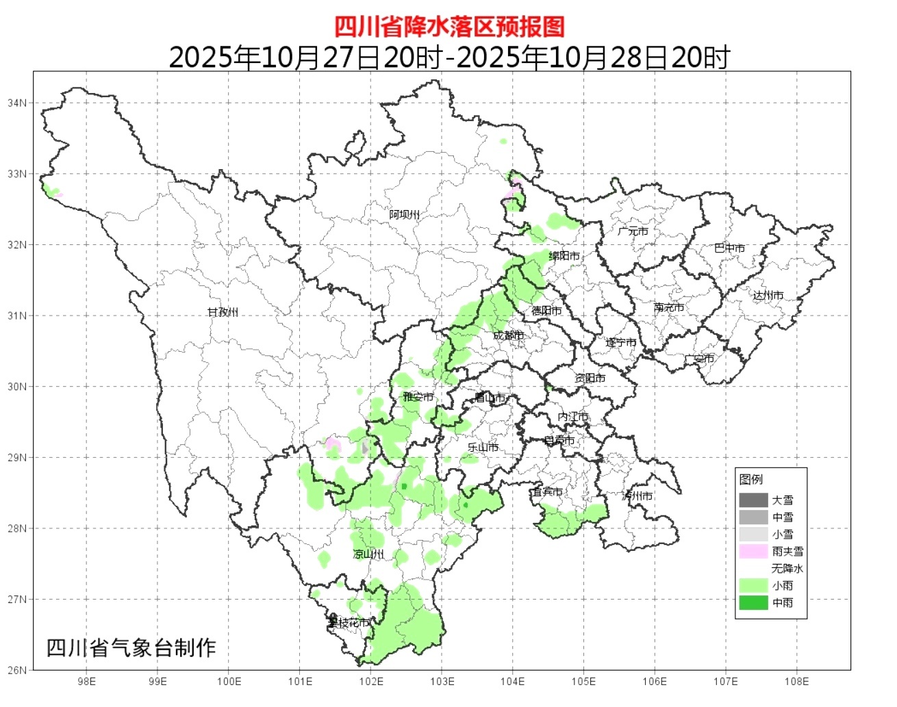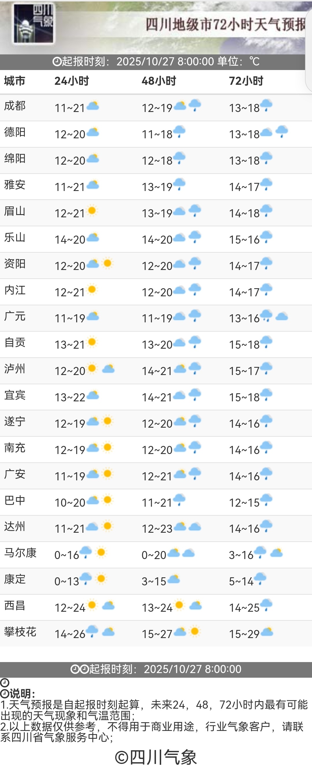 据四川省气象台预报,今天(10月27日)白天,盆地大部和攀西地区大部阴天转多云,川西高原大部多云间晴,仅少数地方有分散阵雨(雪)或小雨。