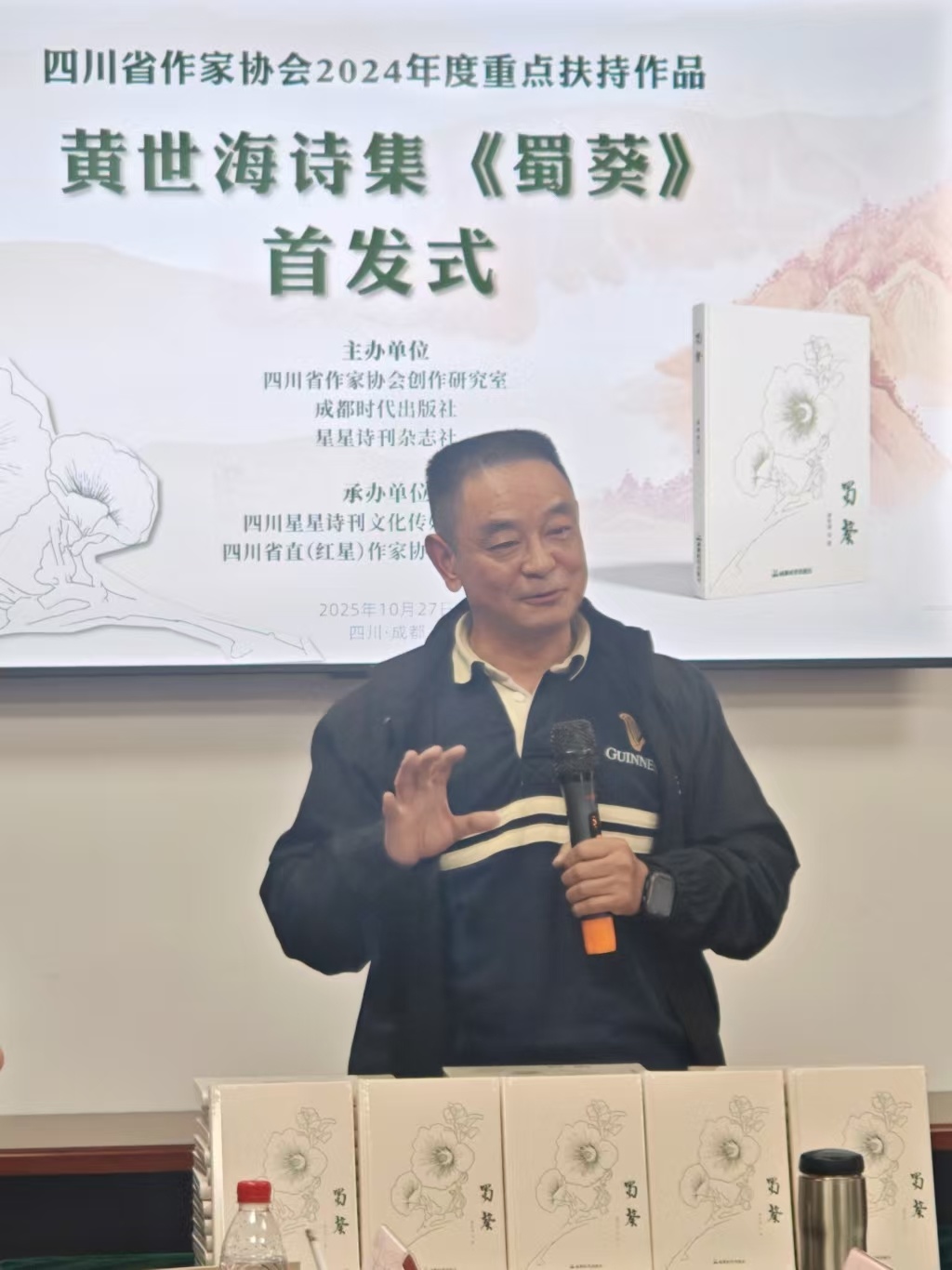 10月27日下午,“黄世海诗集《蜀葵》首发式暨品读会”在成都举行。《蜀葵》作为四川省作家协会2024年度重点扶持作品,是诗人黄世海继《高低重叠》之后推出的又一部力作。诗集以蜀地为精神原乡,收录130余首诗歌,从历史纵深与自然细节中提炼出四川的山川草木与人文气象。品读会上,来自四川文学界的评论家、诗人与出版人齐聚一堂,共同见证了这部聚焦蜀地人文与自然的诗意之作的正式亮相。