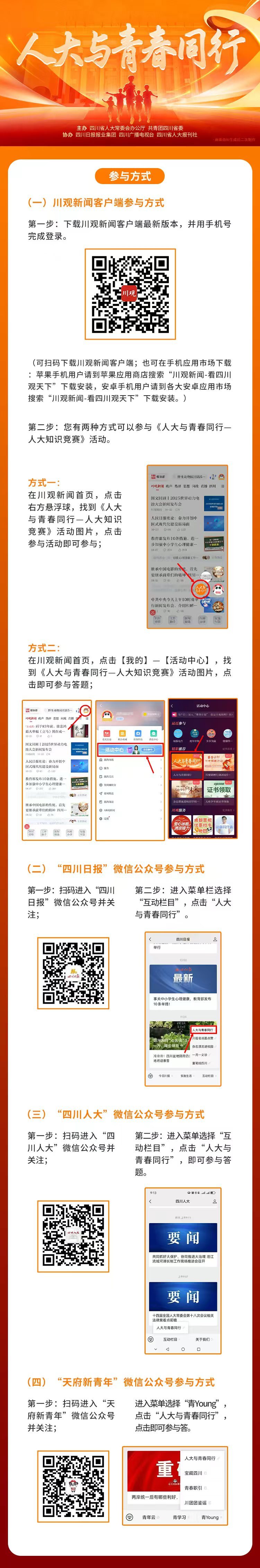 10月28日,由四川省人大常委会办公厅、共青团四川省委联合开展的“人大与青春同行”系列活动三大重磅活动——知识竞赛、短视频作品征集和基层实践体验活动正式启动。即日起,青年朋友可以通过线上线下等多种渠道,深度参与到全过程人民民主实践中,“零距离“感受人民代表大会制度的魅力和活力。