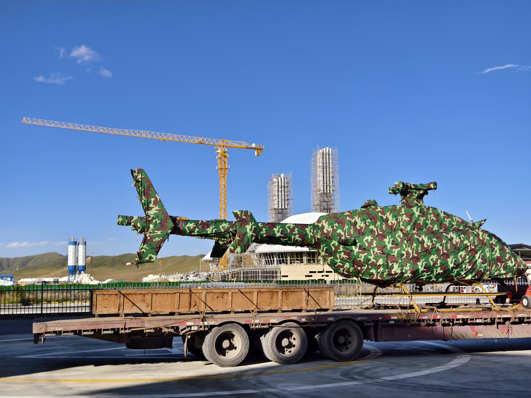 9月23日,若尔盖县低空飞行中心,裹着迷彩布的贝尔407GXi机型直升机停靠在停机坪上。图/刘泳含