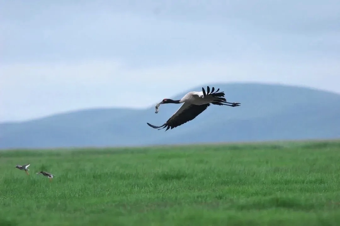 秋风微凉,芳草未黄。若尔盖在群山环抱中显得安宁祥和,上千只黑颈鹤在此栖居。当付晗驾驶直升机掠过天际,偶有黑颈鹤在下方远远伴飞。白河如缎、蓝天如洗,鹤与飞机各自翱翔,共同绘就一幅和谐的高原图景。