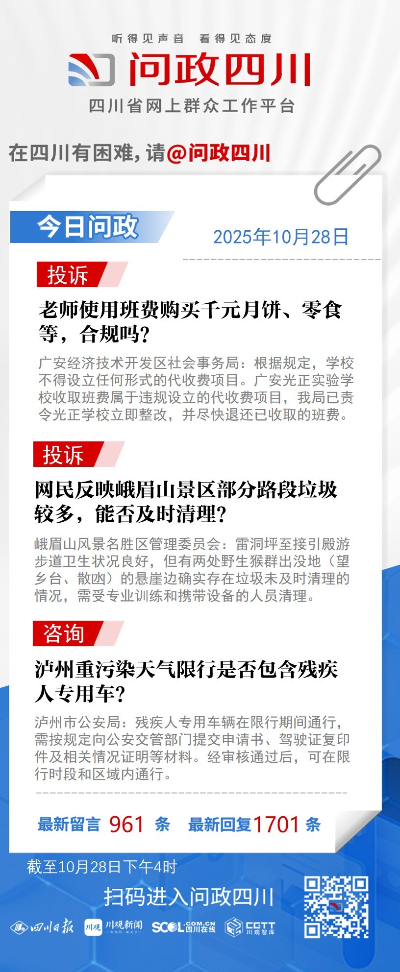 在四川有困难,找问政四川。如果您在四川遇到了操心事、烦心事、揪心事,请登录“四川省网上群众工作平台—问政四川”或拨打问政四川热线(028-96001)留言反映、求助或建议。我们将充分发挥平台的互动联系作用及舆论监督功能,第一时间传递民声,推动问题得以及时解决——听得见声音,看得见态度。
