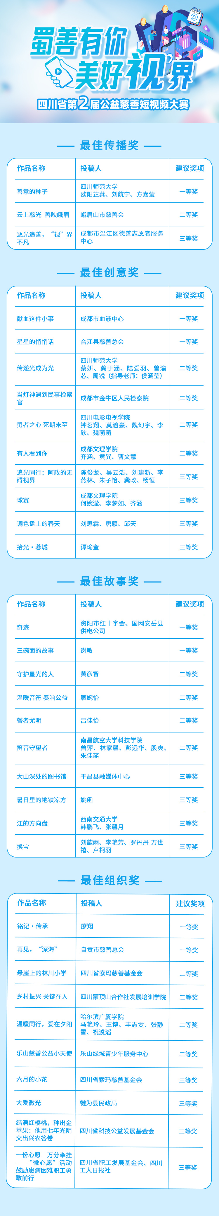 近期,“蜀善有你 美好‘视’界” 四川省第二届公益慈善短视频大赛评审工作顺利开展,经专家现场审议,并综合大赛网络点赞结果,共评选出33个获奖作品。现将获奖名单予以公布。