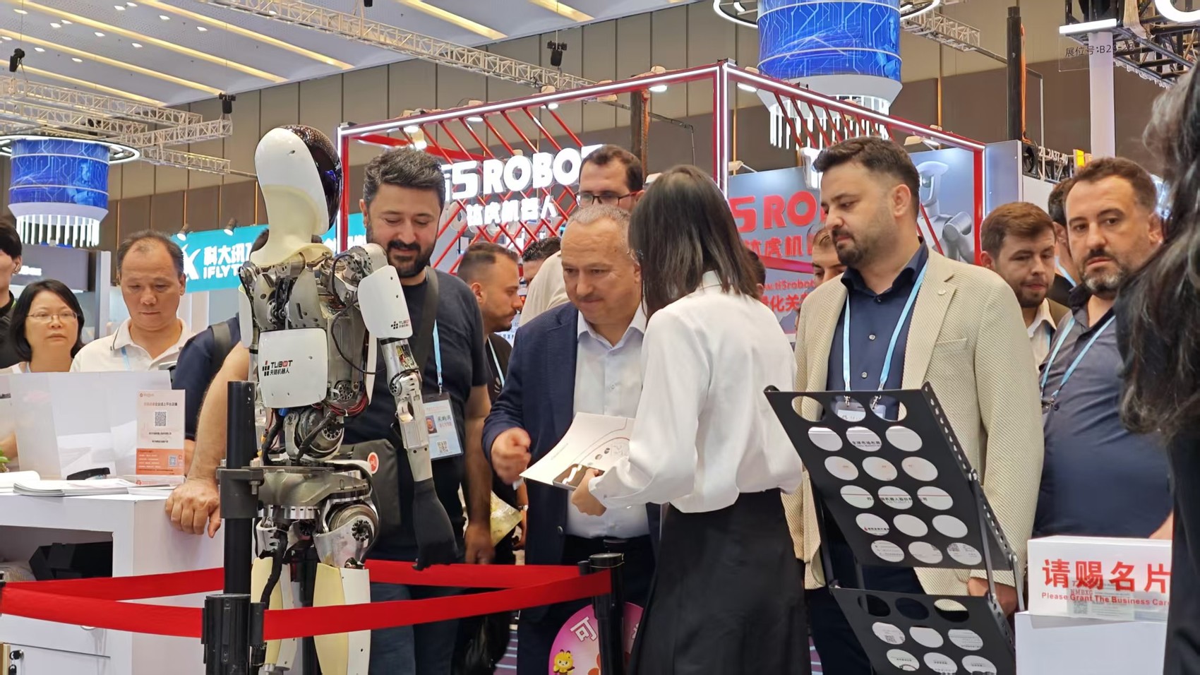 广交会期间,四川天链机器人展台前,工作人员向境外客商讲解人形机器人产品性能。(商务厅供图)