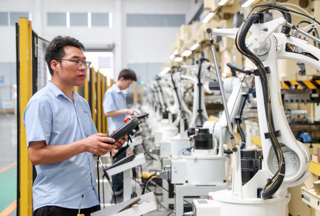 近日,华蓥市华蓥山经开区四川怡田科技有限公司内,员工在智能车间操控机器生产外贸订单。(邱海鹰 摄)