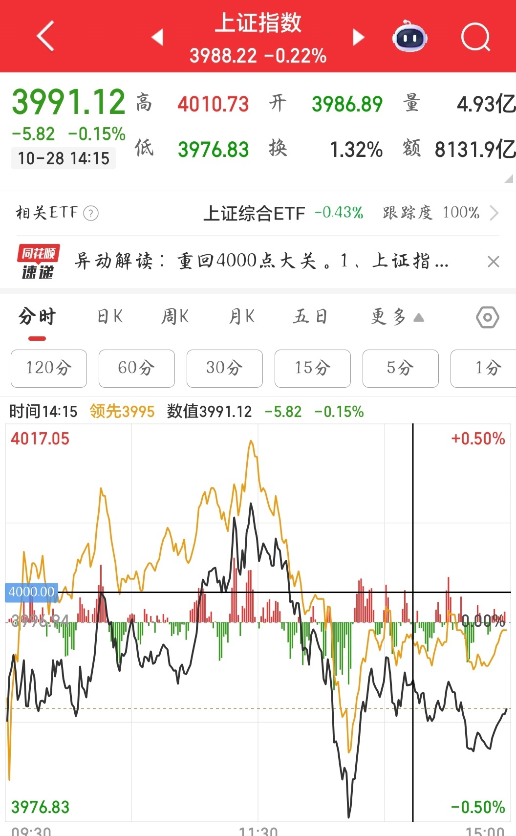 10月28日的A股市场上演了一场“十年之约”的剧情反转——早盘10点14分,上证指数时隔十年再度突破4000点整数关口,最高冲至4010.73点,然而短暂停留后便震荡回落,最终报收3988.22点,较前一日下跌0.22%,上演了一场“得而复失”的大戏。深证成指和创业板也从低开到翻红再到收跌,收盘最终跌0.44%、0.15%。全市场2366只个股上涨,成交额达2.17万亿元,在关键点位的博弈中显现出明显的多空分歧。