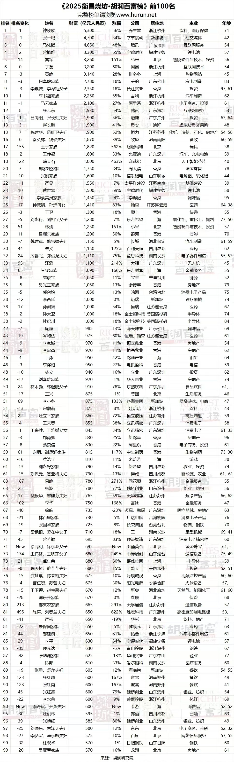 71岁的农夫山泉创始人钟睒睒财富增长1900亿元,以5300亿元第四次成为中国首富,并刷新了中国首富的财富纪录。42岁的字节跳动创始人张一鸣财富增长1200亿元,但仍以4700亿元退居第二。54岁的腾讯创始人马化腾财富增长1500亿元,以4650亿元保持第三。