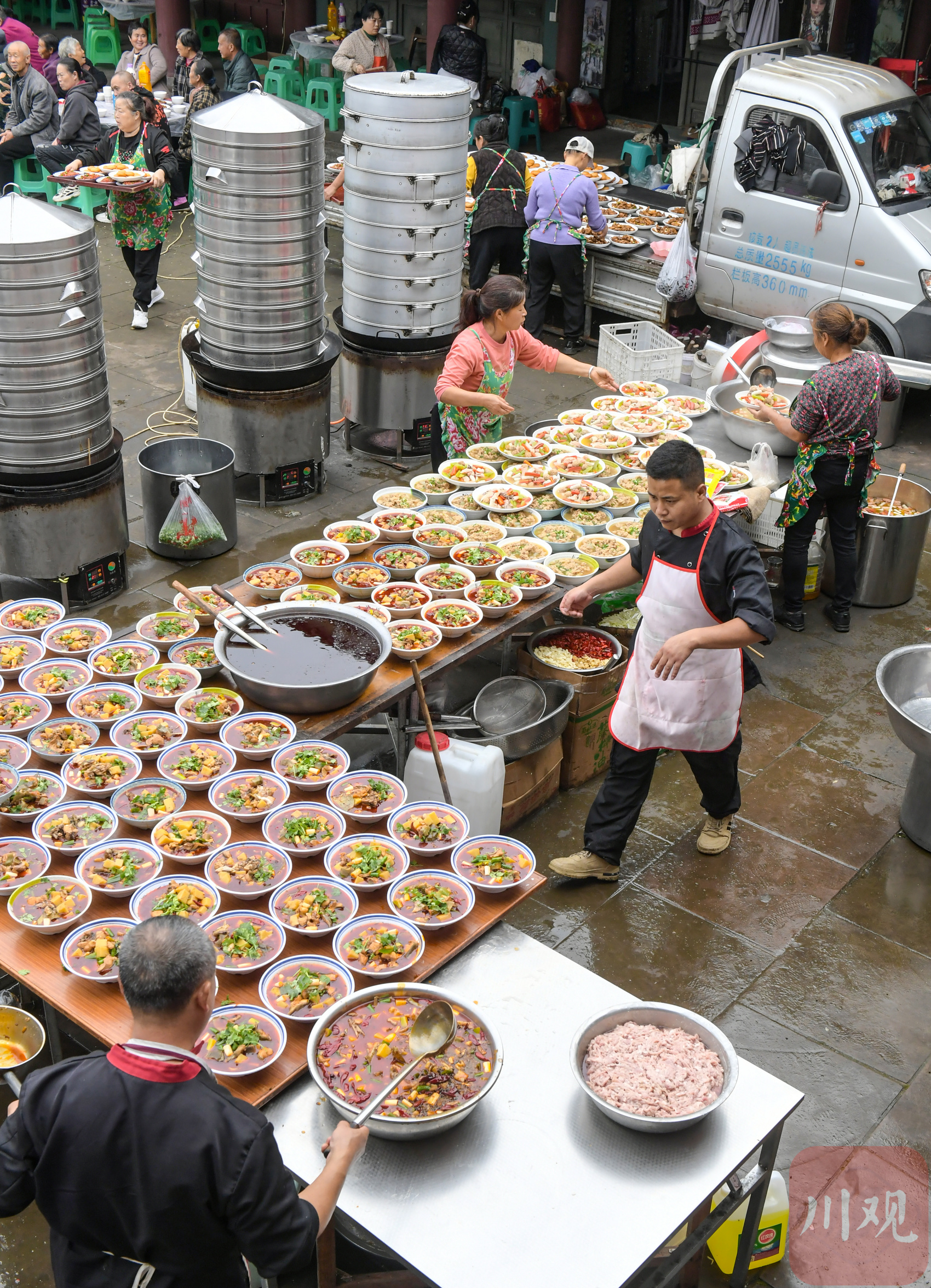 在成都市双流区黄龙溪镇黄龙社区黄龙大剧院,厨师配制“坝坝宴”菜品。