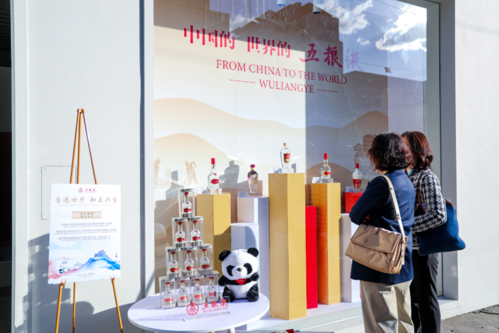 活动现场,入口处的宽大落地窗被精心设计为仪式感十足的品牌橱窗,陈列着多款五粮液核心产品,吸引着往来行人的目光。