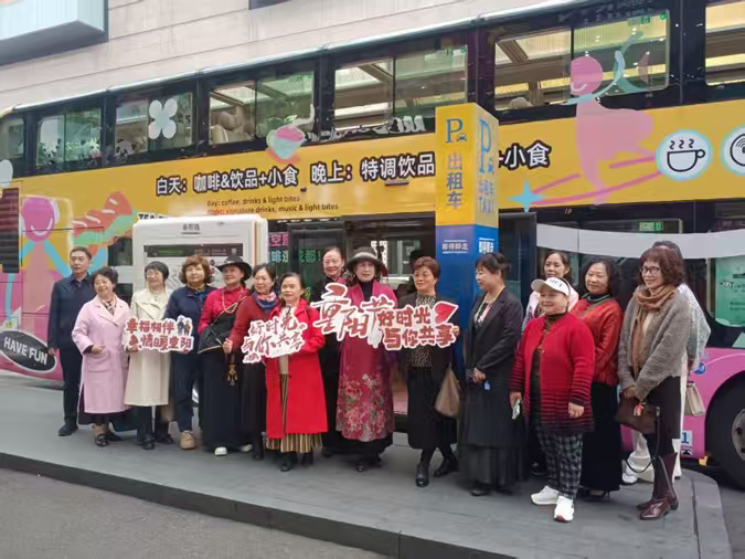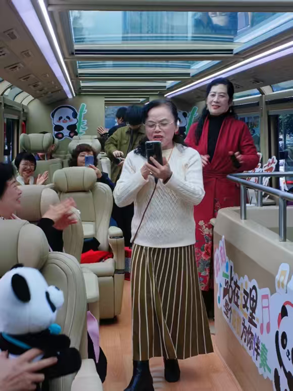 《最美夕阳红》《年轻的朋友来相会》《我和我的祖国》……10月28日下午,准时从成都春熙路发车的“蓉火火茶歇巴士”上飘来阵阵歌声。当天,一场专为银发群体打造的“乐龄乐旅 快乐重阳”特别活动举行,16位来自四川开放大学乐龄学院的学员在车上开“潮趴”。