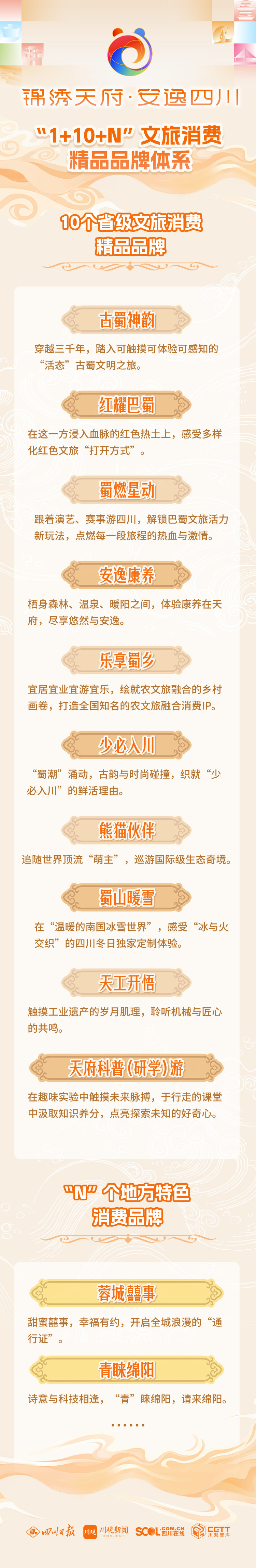 10月29日,2025四川省文化和旅游发展大会暨第十一届中国(四川)国际旅游投资大会上,首发全省“1+10+N”的全省文旅消费精品品牌矩阵:以“锦绣天府·安逸四川”文旅品牌为统领,统筹推出“古蜀神韵”“红耀巴蜀”“蜀燃星动”“安逸康养”“乐享蜀乡”“少必入川”“熊猫伙伴”“蜀山暖雪”“天工开悟”“天府科普(研学)游” 10个省级文旅消费精品品牌,成都“蓉城囍事”、绵阳“‘青’睐绵阳”等N个市(州)地方特色消费品牌,形成省市联动、主题鲜明、供给丰富、体验优良的文旅消费精品品牌体系。
