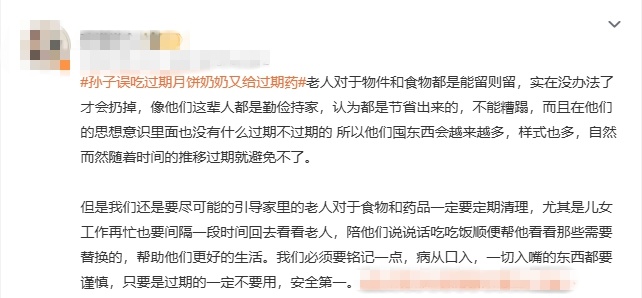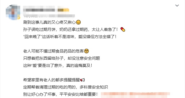老人们或许觉得,把食品药品存起来是为了省钱,但这有很大的健康隐患。尤其是过期药品,不只药效下降,甚至可能产生有毒有害物质。正如这位网友所说,这样的“爱”出了意外,真的会追悔莫及……