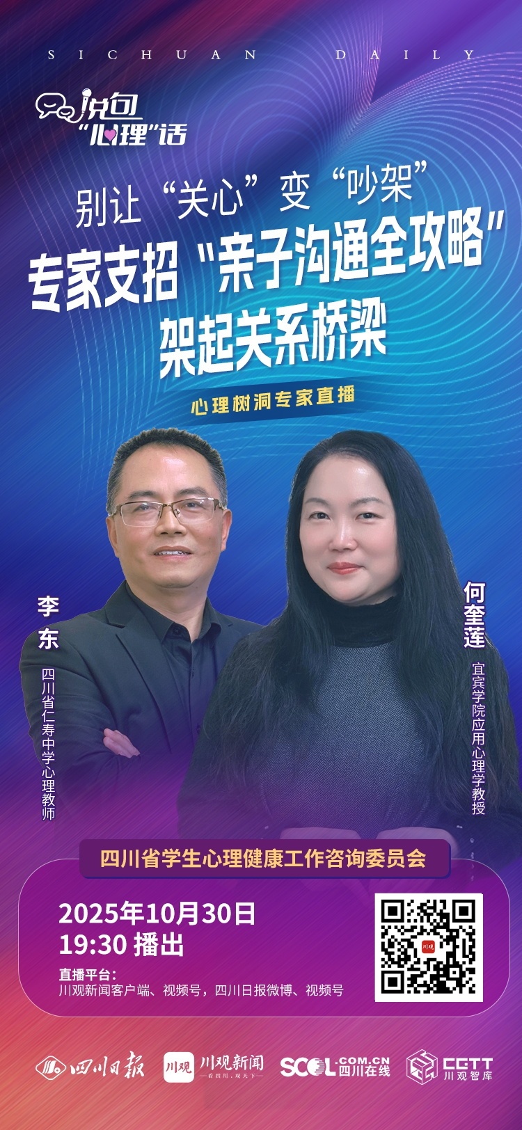 10月30日19:30,川观新闻邀请到四川省学生心理健康工作咨询委员会深耕心理健康与亲子沟通领域的两位专家,送上超实用的“亲子沟通全攻略”!