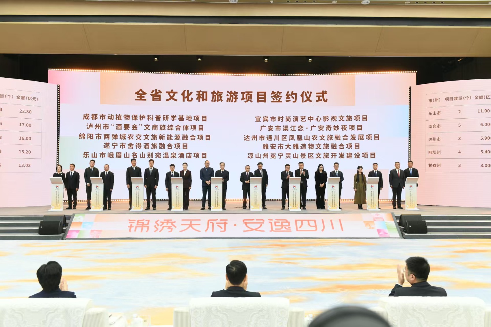 本次大会注重招商引资,通过精准对接、高效促成,实现“对接一批项目,促成一批项目,签约一批项目”的良性循环,把四川的文旅资源优势转化为高质量发展优势。会上,全省114个重大文旅项目集中签约,总金额达567.96亿元。其中成都市动植物保护科普研学基地项目、泸州市“酒要会”文商旅综合体项目、绵阳市两弹城农交文旅新能源融合项目等10个代表性项目现场签约,金额达135.4亿元。