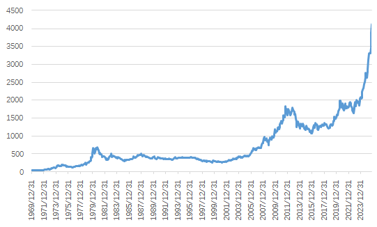 1970年以来黄金价格走势(数据来源:Wind,图中展示伦敦现货黄金价格,单位为美元/盎司,按月统计,统计区间为1969/12/31-2025/10/23)