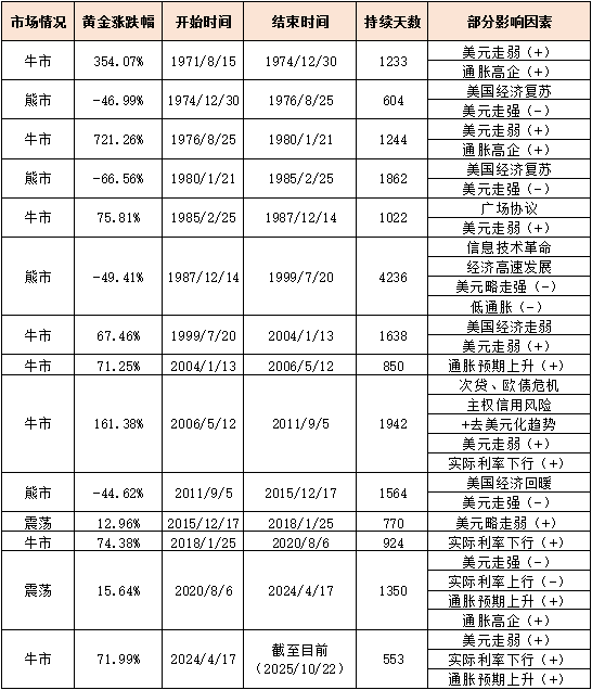 驱动黄金价格的因素比较复杂,其价格波动也难有一般规律可循,一次起落周期有时很长、有时很短。例如下面所列不同时期对黄金走势的部分影响因素,黄金市场每一轮牛熊变换背后的原因都各不相同。