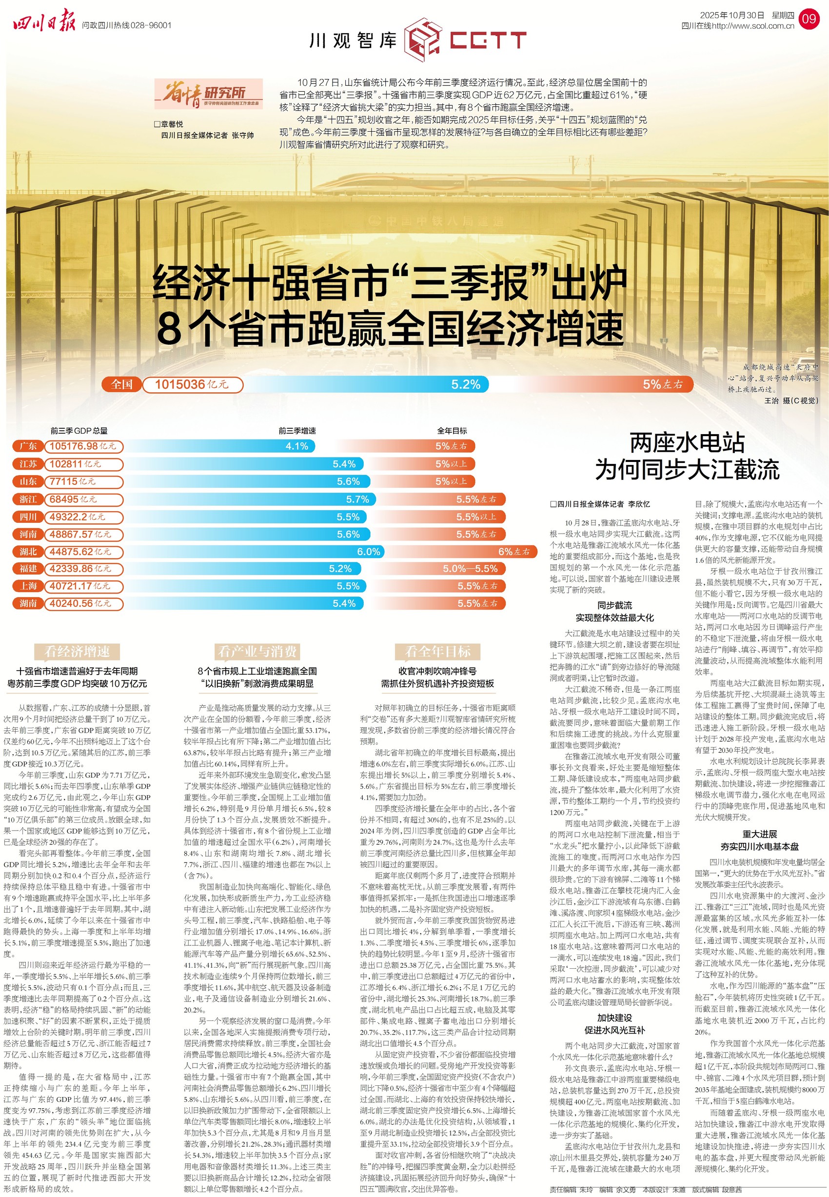 经济总量位居全国前十的省市已全部亮出“三季报”。十强省市前三季度实现GDP近62万亿元,占全国比重超过61%。十强省市增速普遍好于去年同期,有8个跑赢了全国。今年是四川近年来经济运行最平稳的一年,跃升并稳坐全国第五。具体情况如何,关注今日九版。