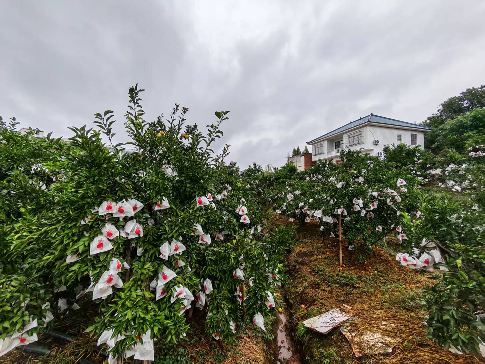 10月24日,细密的秋雨依然未停。钟军吃过早饭,穿上防水靴,从工棚出发,照常沿着分布在浅丘果园间的土路,开始巡园。这是他每天的功课,走一圈要花将近1个小时。