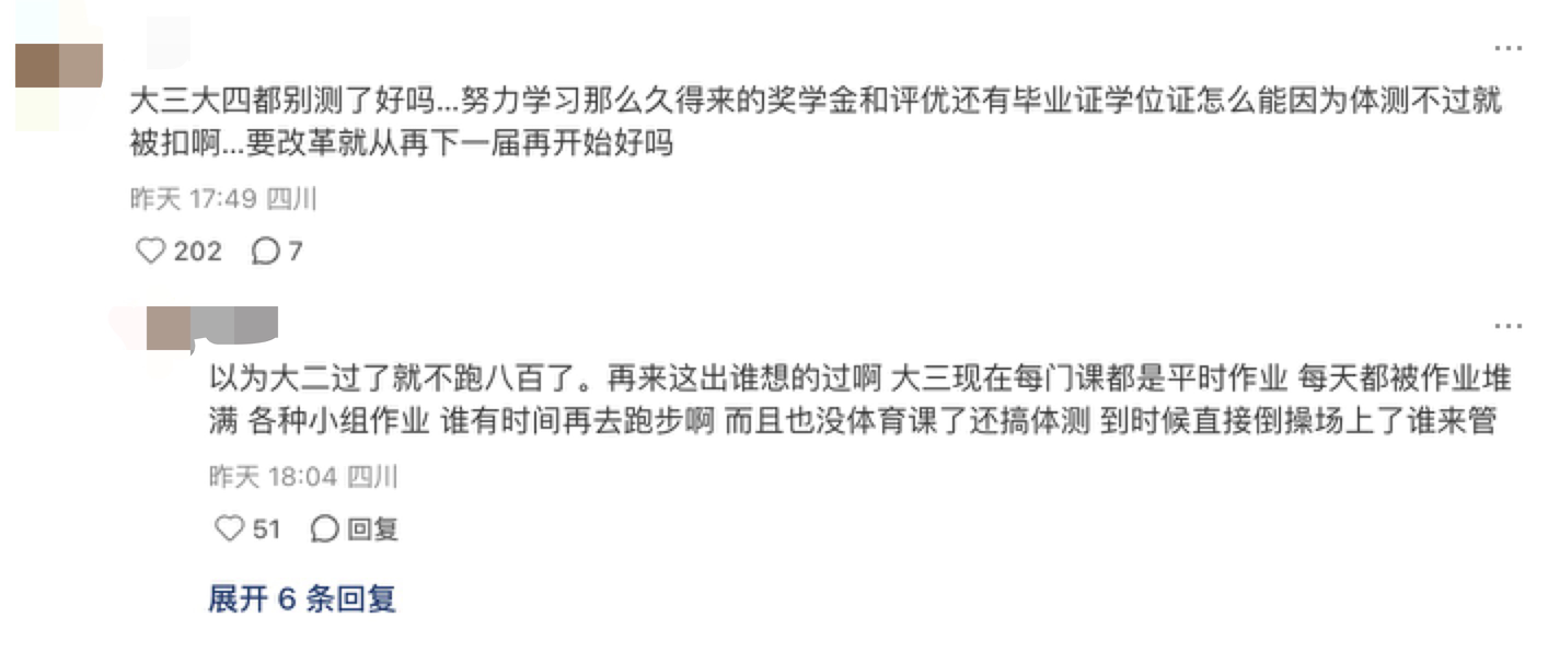 社交平台上,类似声音不少,有帖子质疑“没有体育课了还搞体测”,也有人表示“努力那么久得来的毕业证学位,怎么能因为体测不过就被扣啊……”