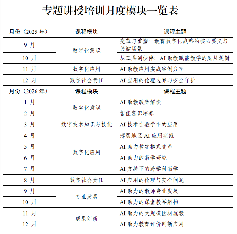 按照教育部实施数字化赋能教师发展行动的工作部署,教育厅制定了专门工作方案,规划了全员普及培训、专题讲授培训、关键少数培训等六类培训主题,其中全员普及、专题讲授培训通过在线方式实施,常态化培训到2026年底。