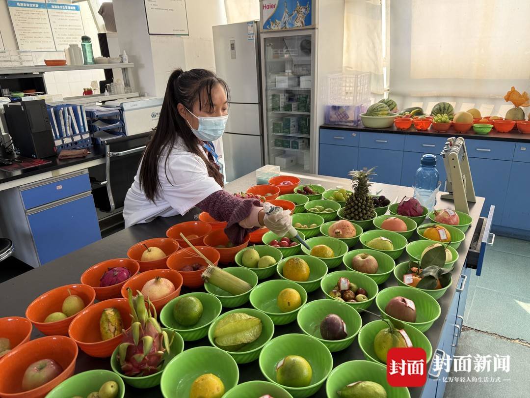 在四川雨润国际农产品交易中心,在门口有一间检验室,桌子上摆放着各类蔬菜水果,一名工作人员正在将试剂滴入装着蔬菜水果容器内,对它们农残等指标进行检测。