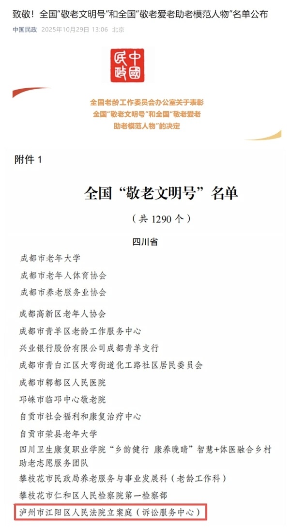 10月29日,全国老龄工作委员会办公室发布关于表彰全国“敬老文明号”和全国“敬老爱老助老模范人物”的决定。其中,泸州市江阳区人民法院立案庭(诉讼服务中心)上榜全国“敬老文明号”。