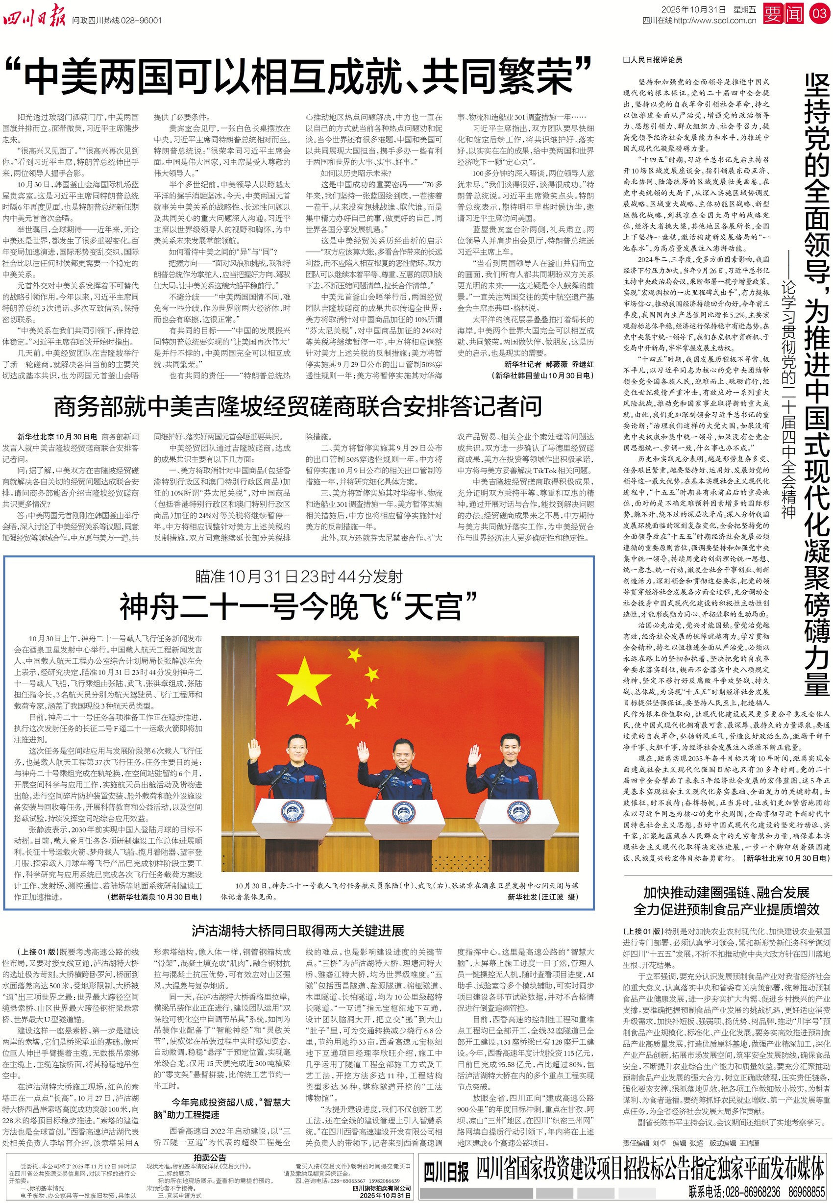 无论是神舟二十一号将飞“天宫”,还是中华文化天府论坛启幕“天府”,我们的征途是星辰大海,我们的明天会更加精彩!